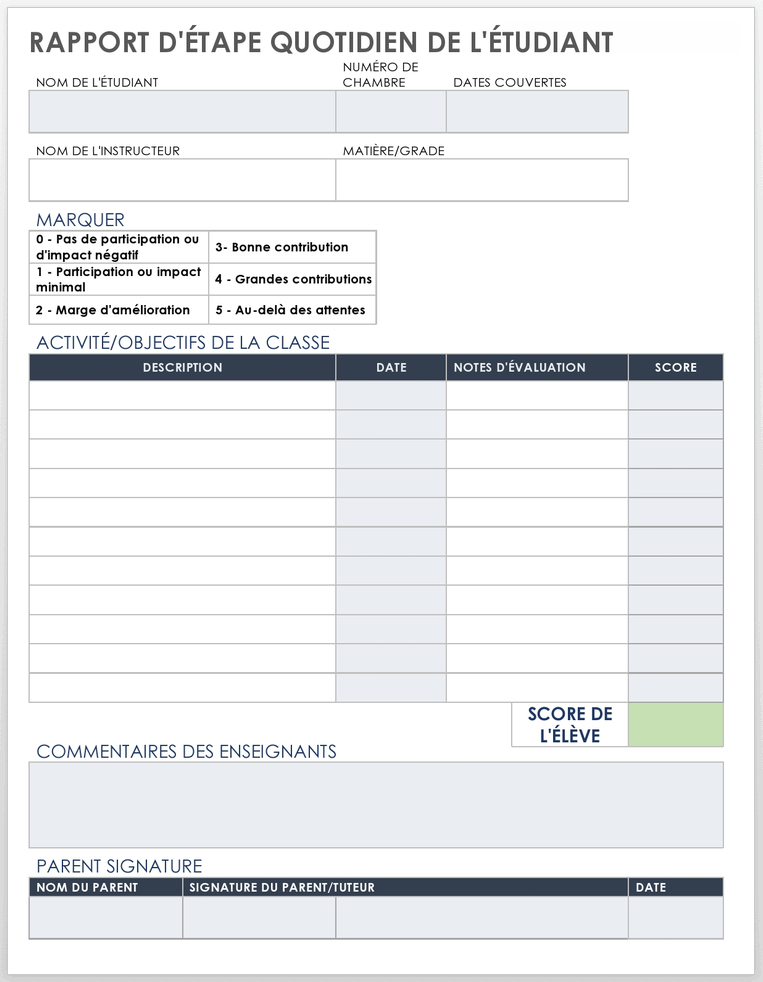 Télécharger le modèle de rapport quotidien sur la progression d’un élève